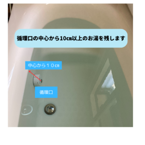 - 手順:入浴後、浴槽の循環口の中心から10cm以上の高さまで残り湯を残しておきます。