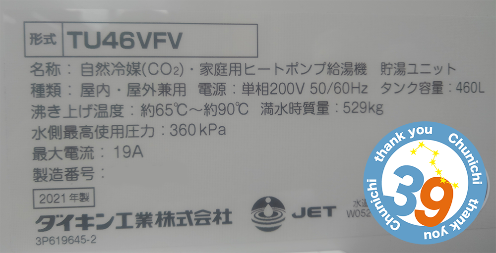 施工場所 一宮市 施工概要 エコキュート交換工事 施工前の型式 エコキュート 施工後の型式 EQ46VFV 施工時間 5時間程度 費用 定価 970,000円税別➡お問い合わせください! 貯湯ユニット TU46VFV ヒートポンプユニット RQW60UV 貯湯ユニット寸法 高さ2,175×幅630×奥行き730mm 質量 69kg ヒートポンプ ユニット寸法 高さ635×幅825(+74)×奥行き300mm 質量 53kg