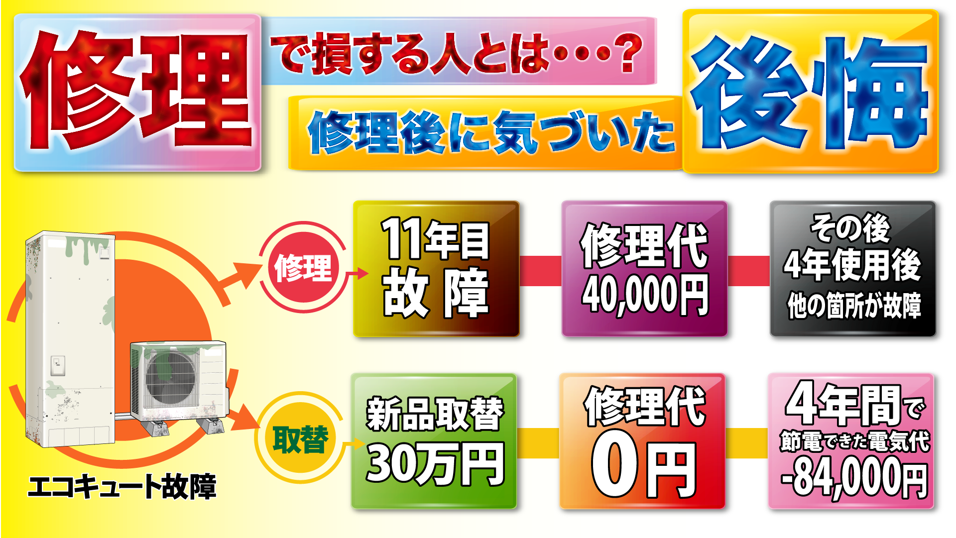 しかし、エコキュートの寿命は15年程度。つまり、4年後には再び故障が発生し、最終的に交換が必要となる可能性が高いのです。